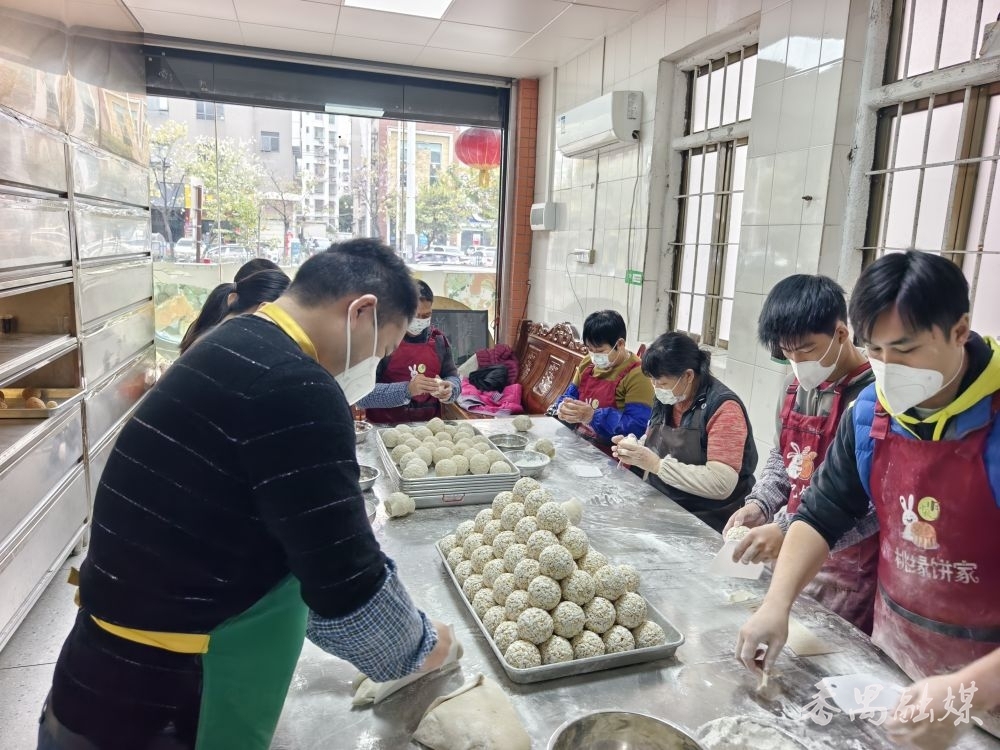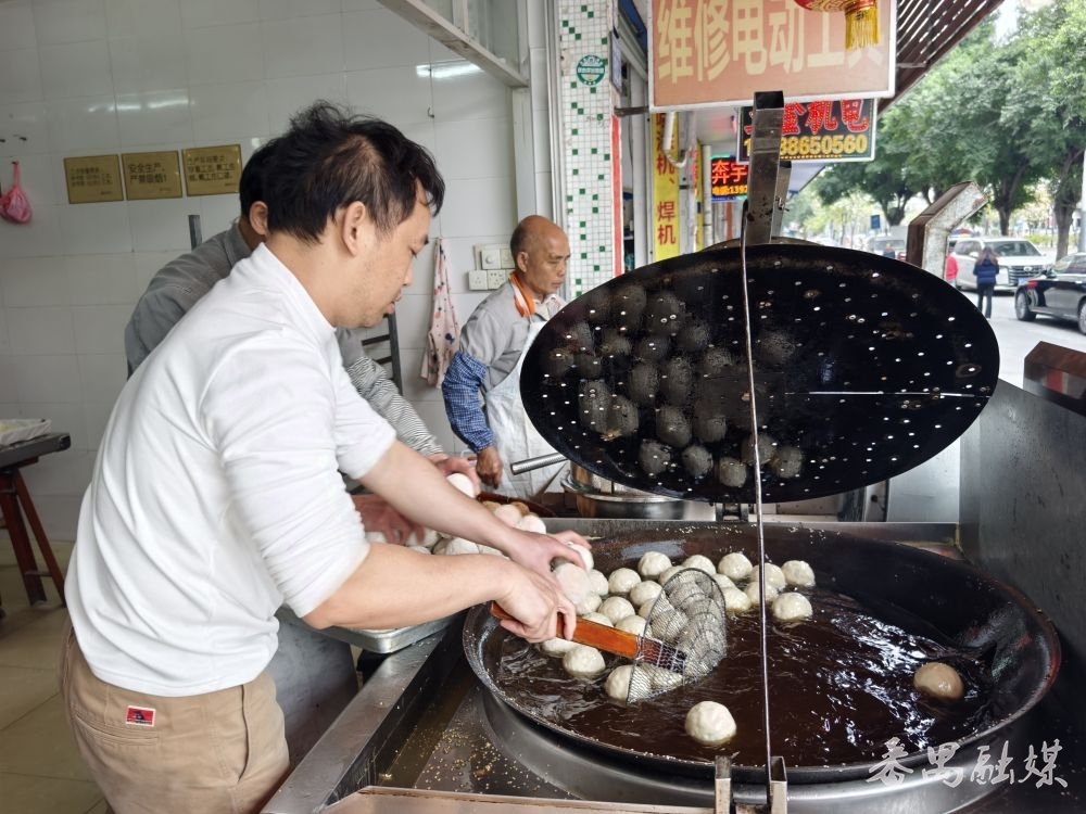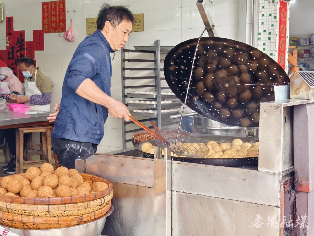不远处的锦记饼店门口,同样架着一口油锅。师傅手持长柄工具,不时翻动锅中的煎堆。店内则俨然一条微型“生产线”:爆米花压制成型、糯米粉皮切分、手工包裹成团……各道工序流畅衔接。经营者胡女士向记者介绍说:“春节快到了,我们特意做传统年宵食品煎堆,寓意团团圆圆、财源滚滚,希望街坊过年吃得开心、图个好意头。”