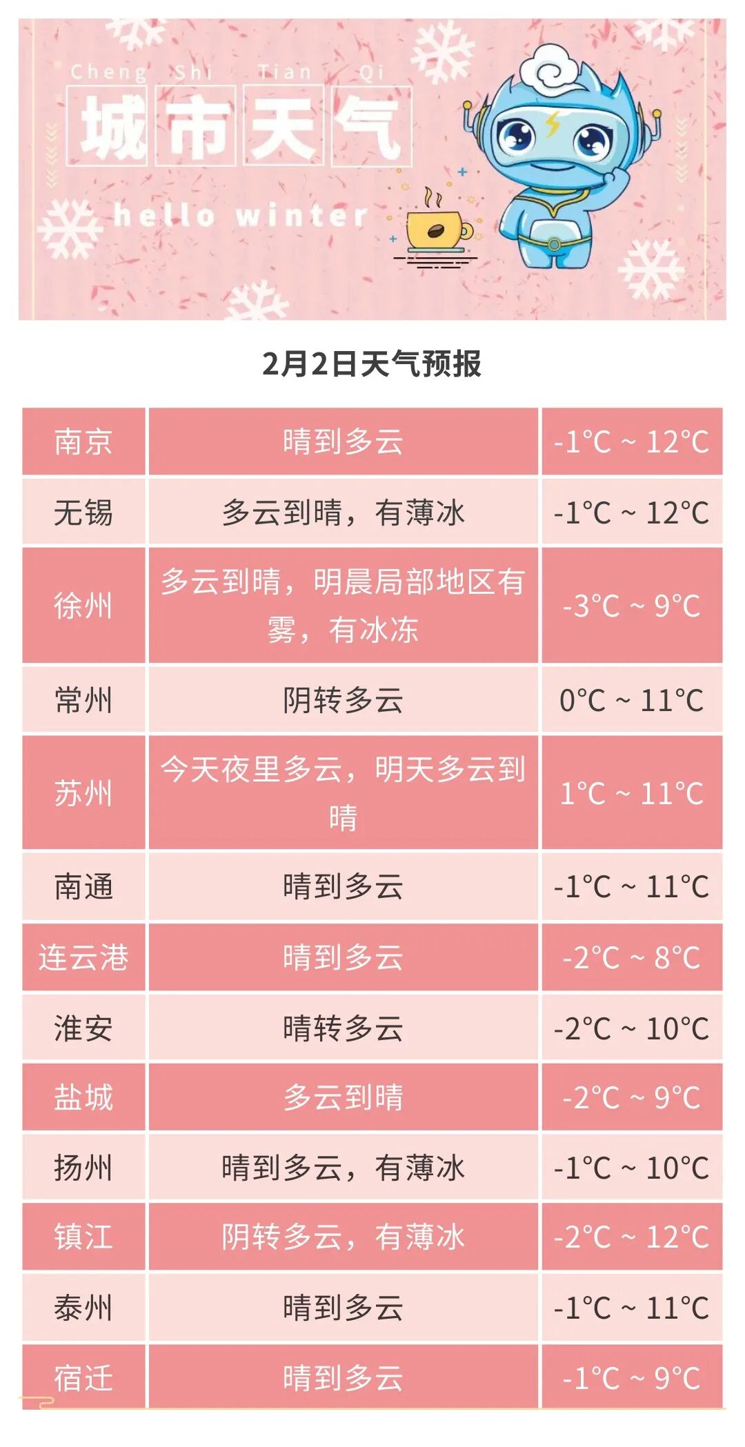 全省晴到多云。最高温度:淮河以南地区11~12℃,其他地区9℃左右;最低温度:淮北地区-2℃左右,其他地区0~-1℃。全省西南风转偏东风,风力都是3-4级。