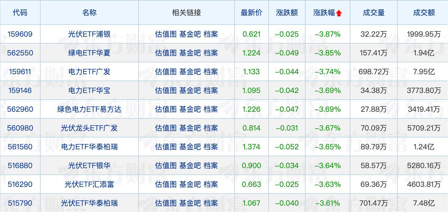 下跌方面,光伏、绿电相关ETF跌超3%。