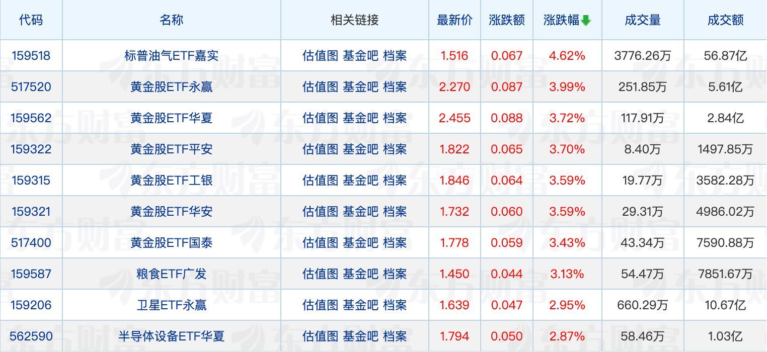 ETF涨跌幅方面,标普油气ETF嘉实涨超4%,黄金股相关ETF涨超3%。